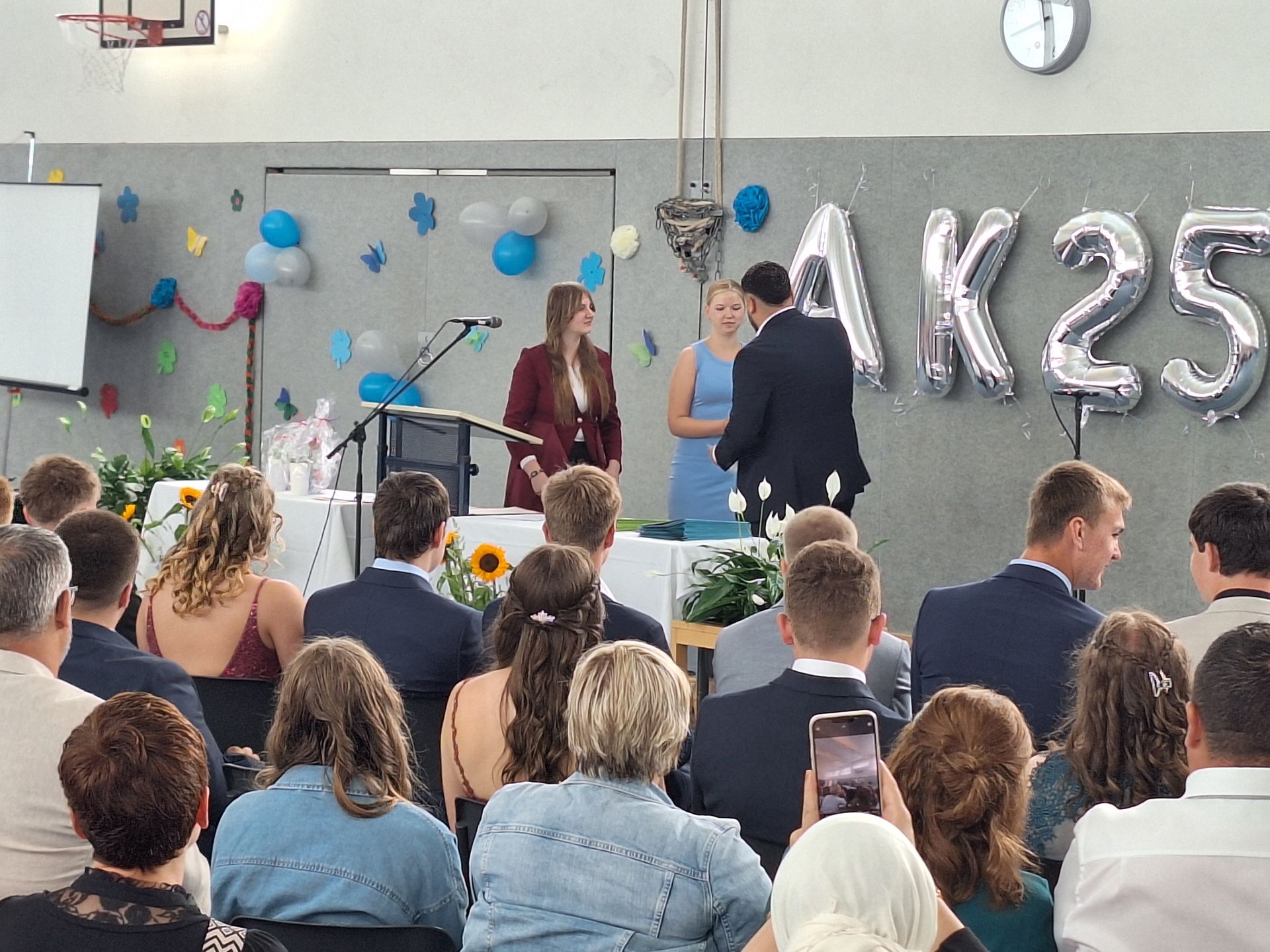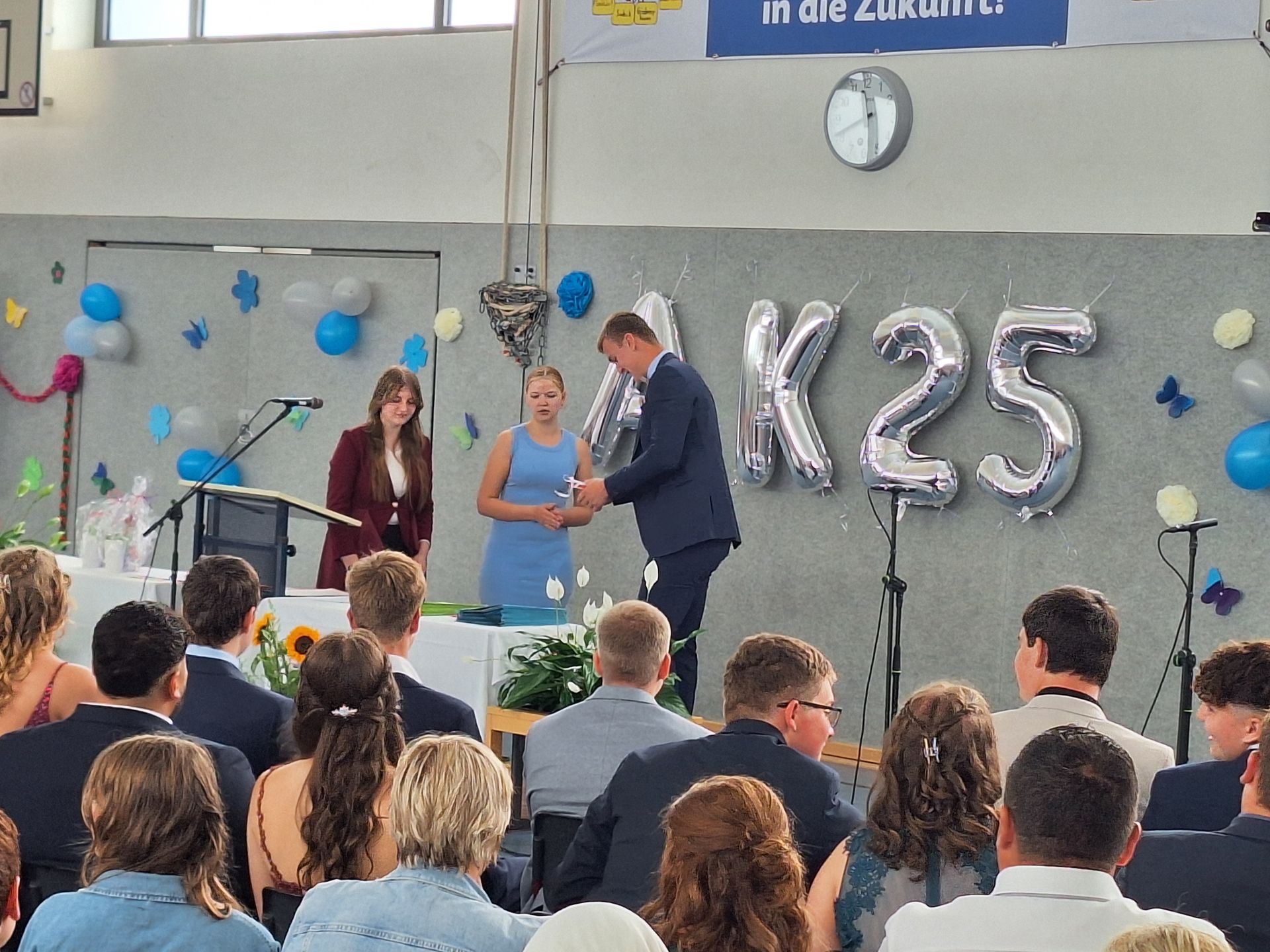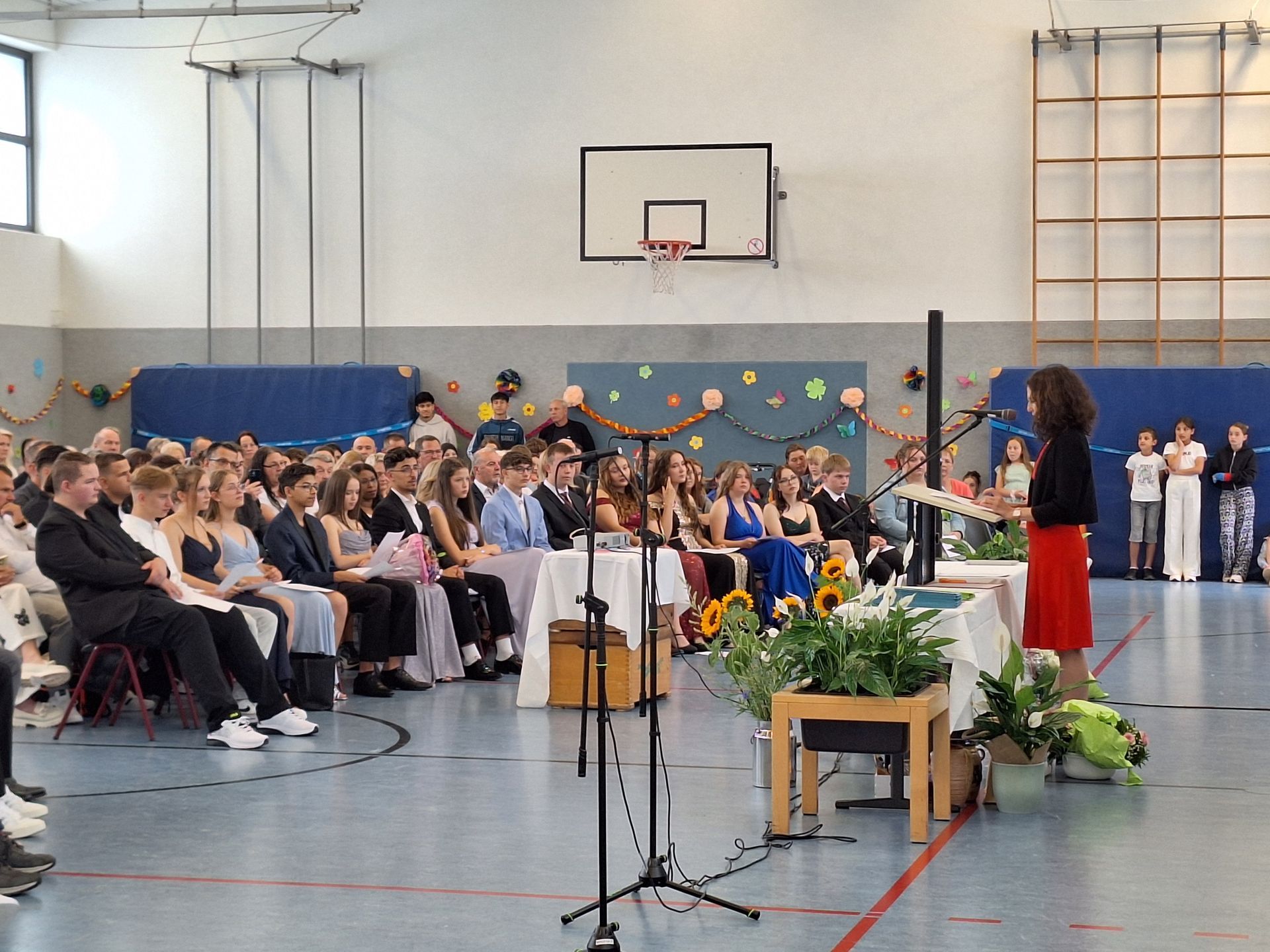 Auch bei Nieselregen ließen es sich die Abschlussschülerinnen und Abschlussschüler nicht nehmen, unter Applaus ein letztes Mal über das Schulgelände zu ziehen und sich von der Schulgemeinde feiern zu lassen. Anschließend kamen beide Abschlussklassen in der festlich geschmückten Turnhalle zusammen, um ihre Zeugnisse entgegen zu nehmen.