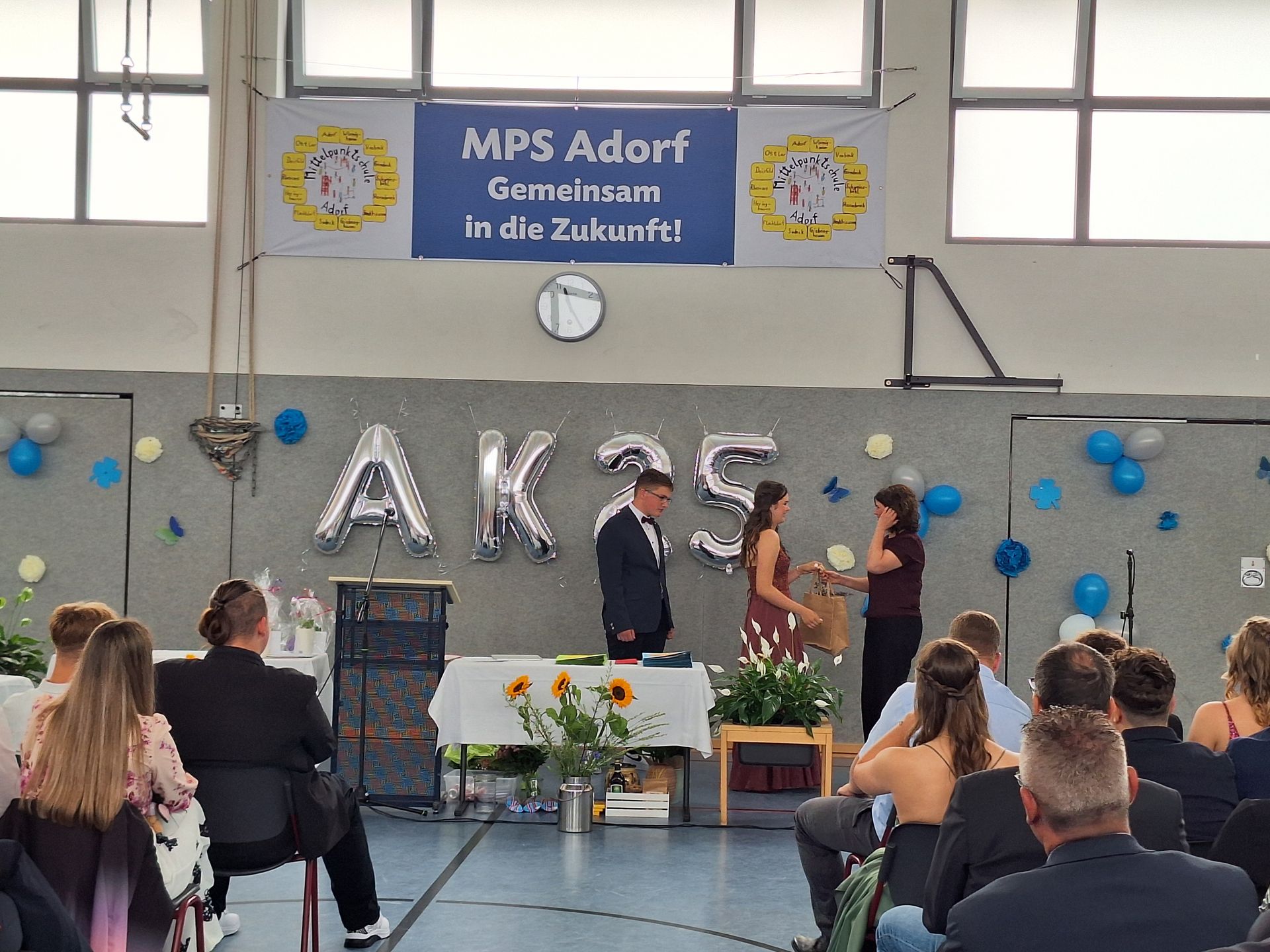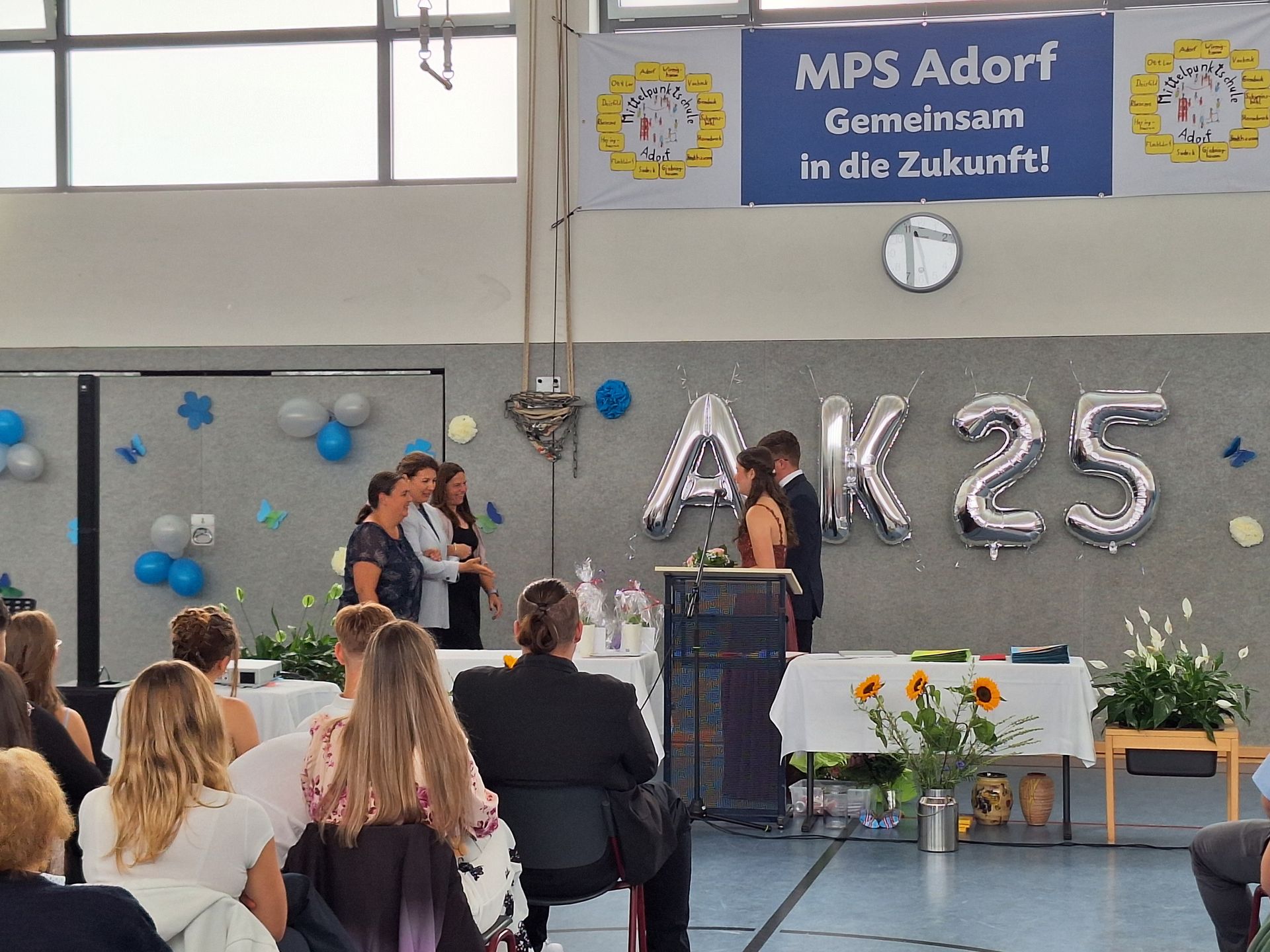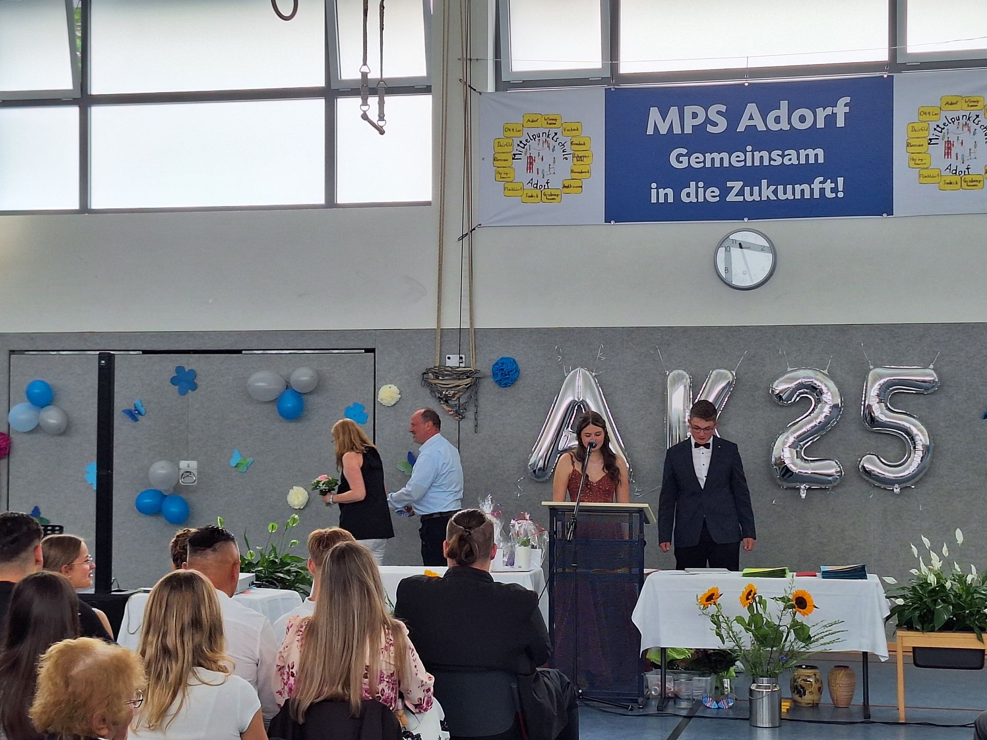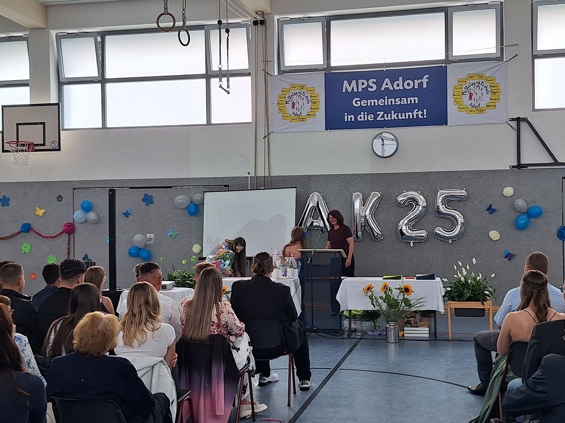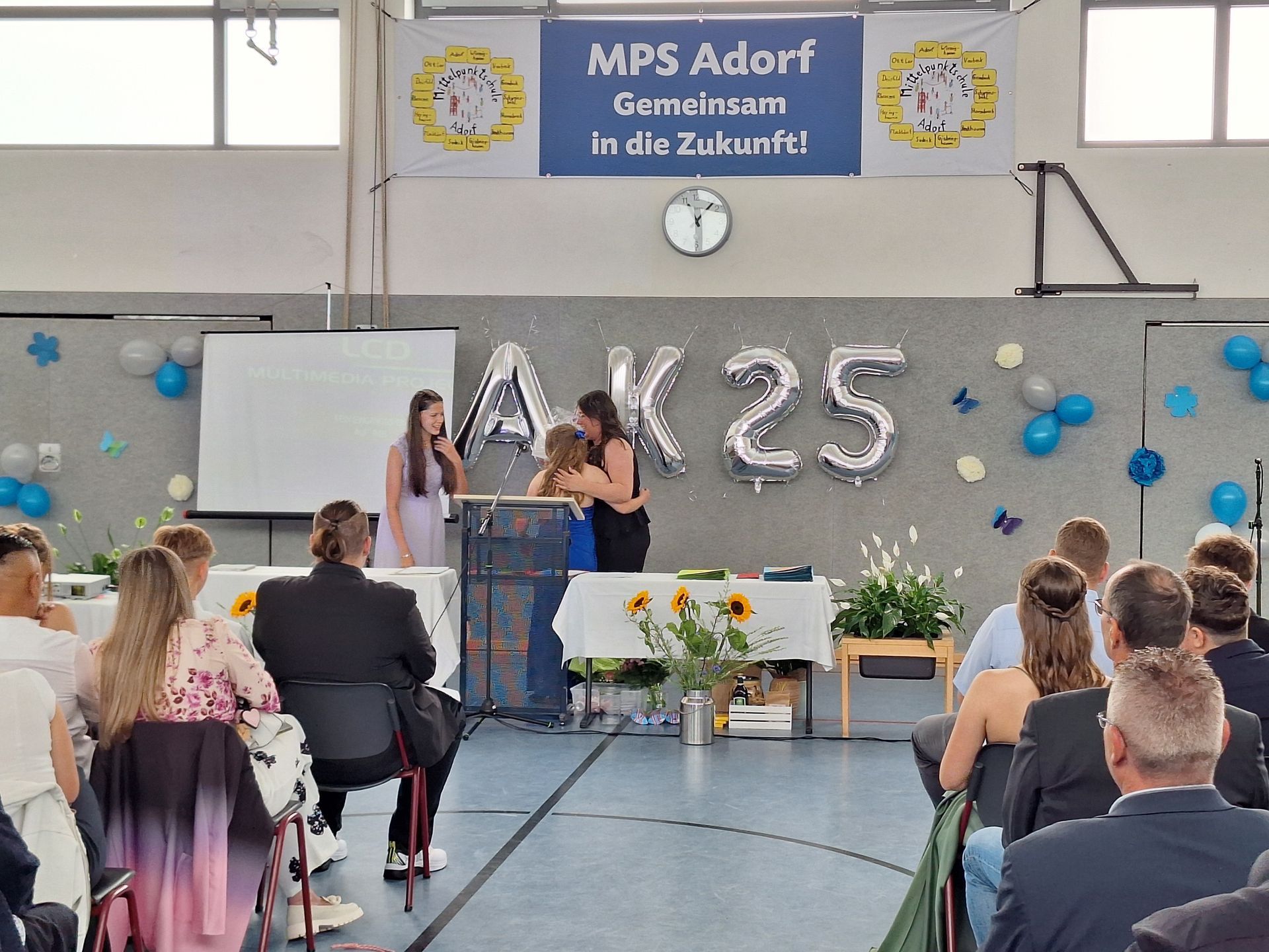 Mit kurzen Worten, aber mit Unterstützung einer Dia-Show ließen beide Abschlussklassen ihre Zeit an der MPS Adorf noch einmal Revue passieren. Die Bilder und Videos zeigten, dass es viele schöne und lustige Momente während der neun oder zehn Jahre in Adorf gab. Im Anschluss wurden die Lehrerinnen und Lehrer, die die Abschlussklassen über all die Jahre begleitet hatten, mit Geschenken bedacht.
