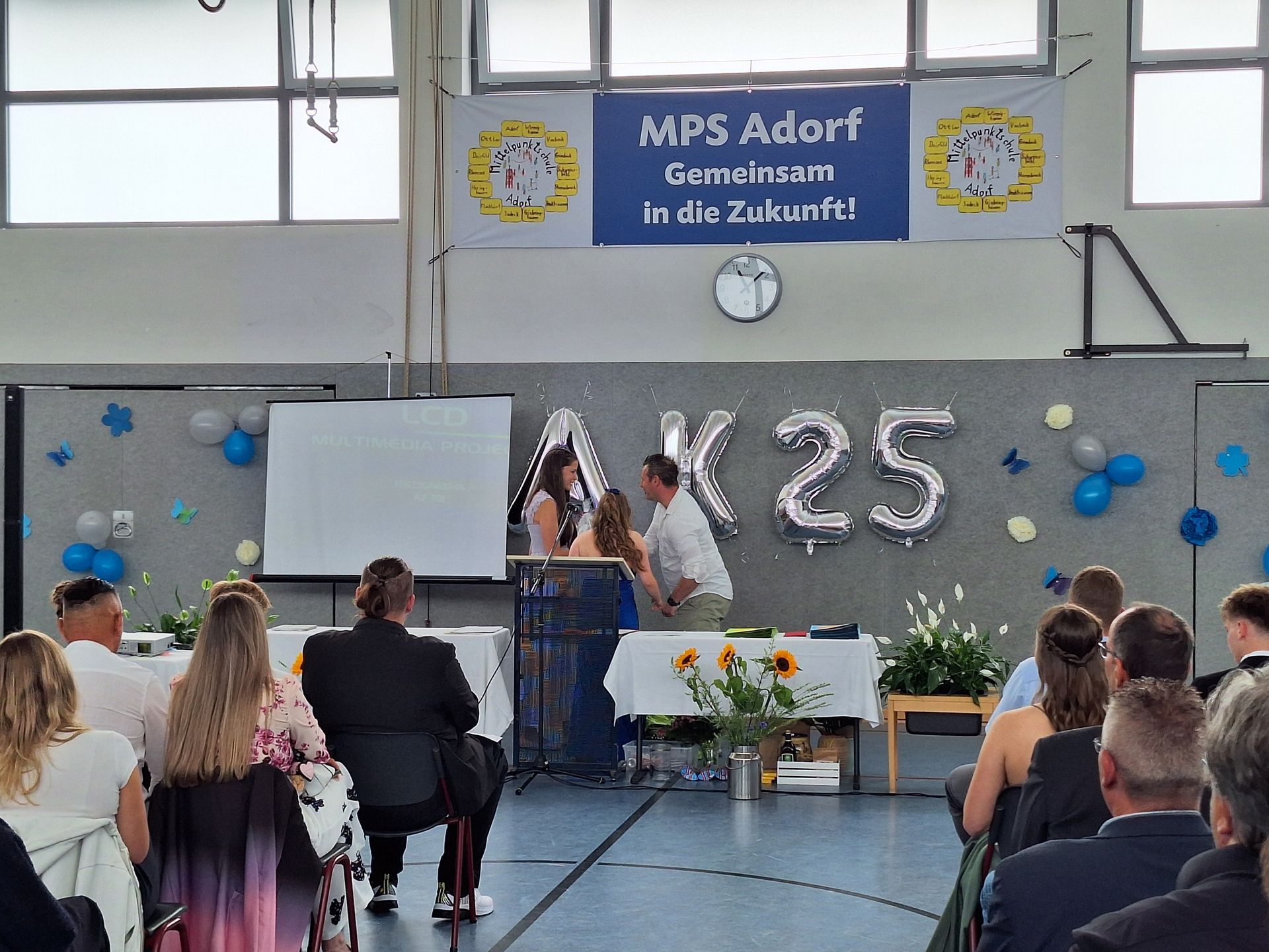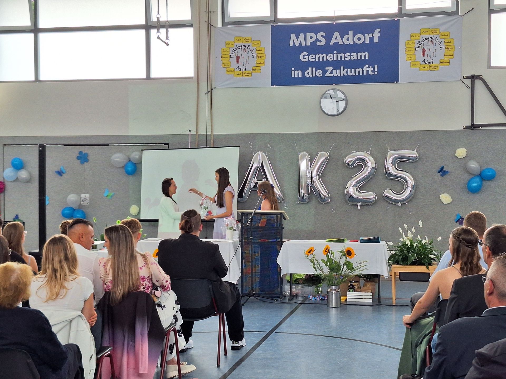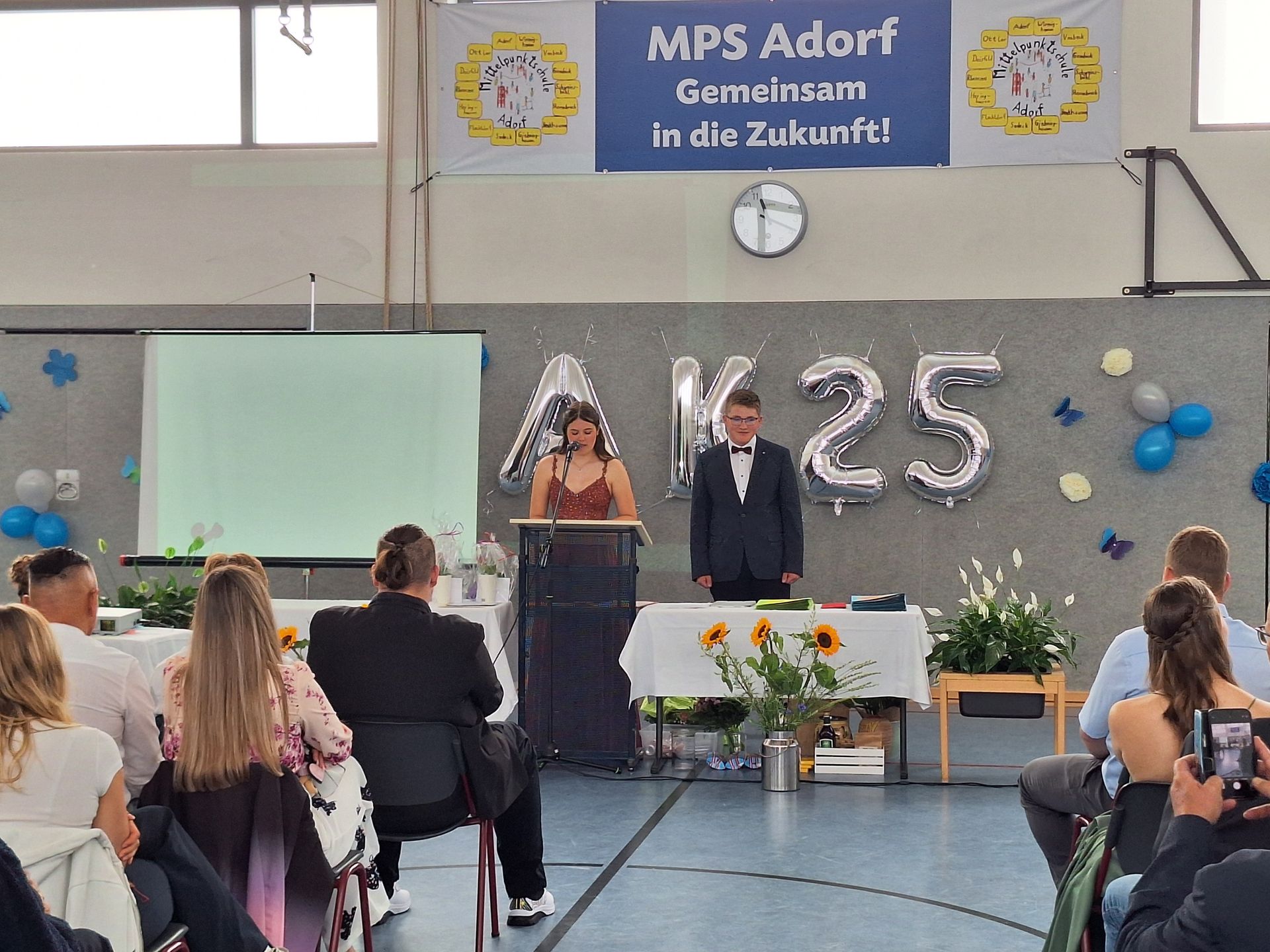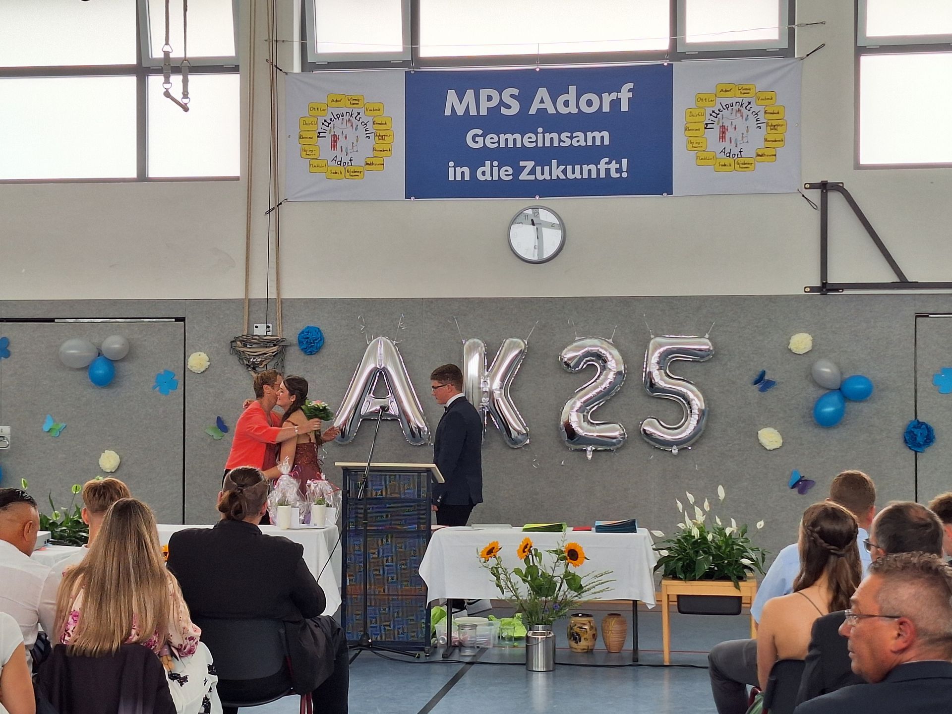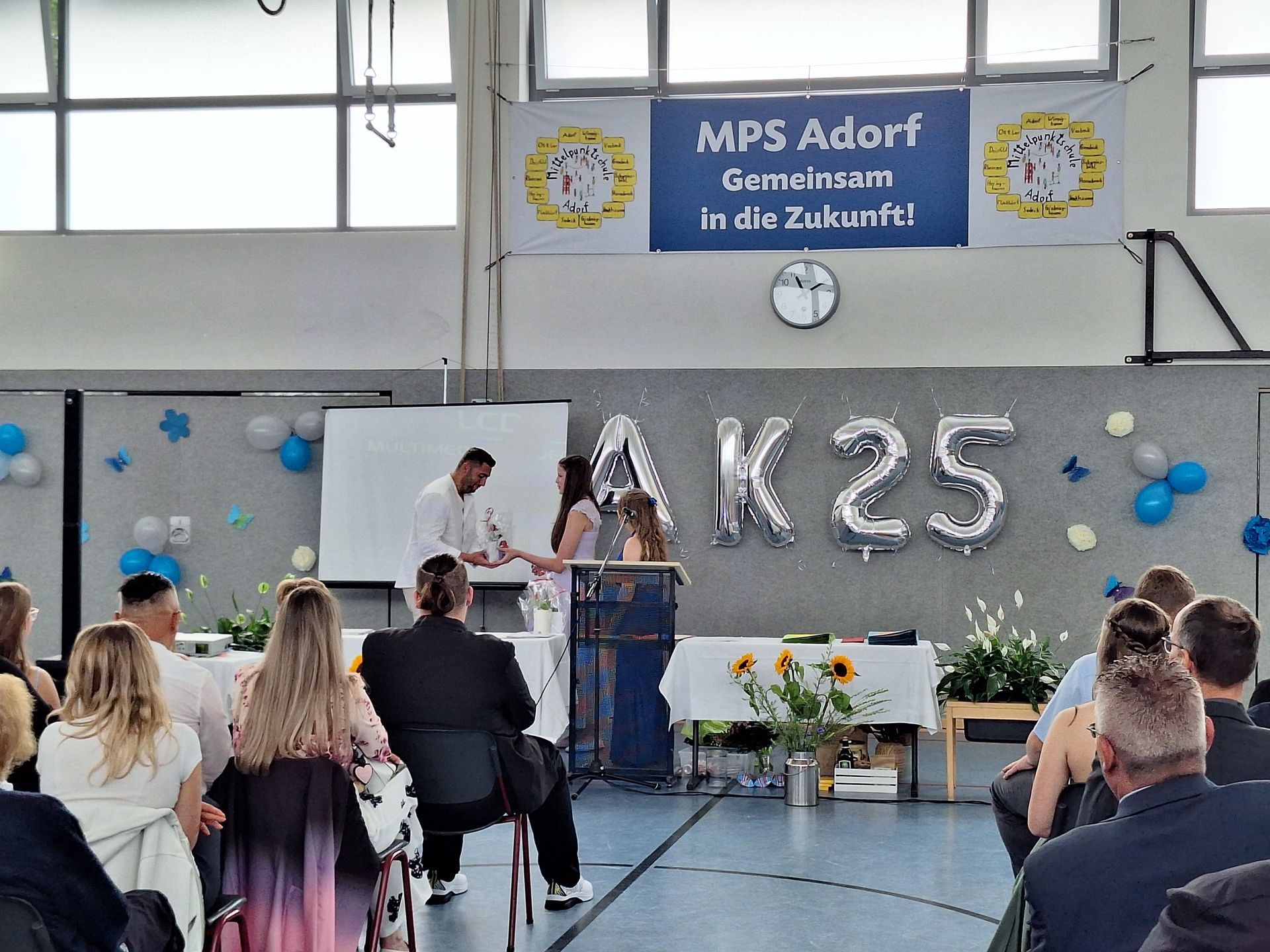 Mit kurzen Worten, aber mit Unterstützung einer Dia-Show ließen beide Abschlussklassen ihre Zeit an der MPS Adorf noch einmal Revue passieren. Die Bilder und Videos zeigten, dass es viele schöne und lustige Momente während der neun oder zehn Jahre in Adorf gab. Im Anschluss wurden die Lehrerinnen und Lehrer, die die Abschlussklassen über all die Jahre begleitet hatten, mit Geschenken bedacht.