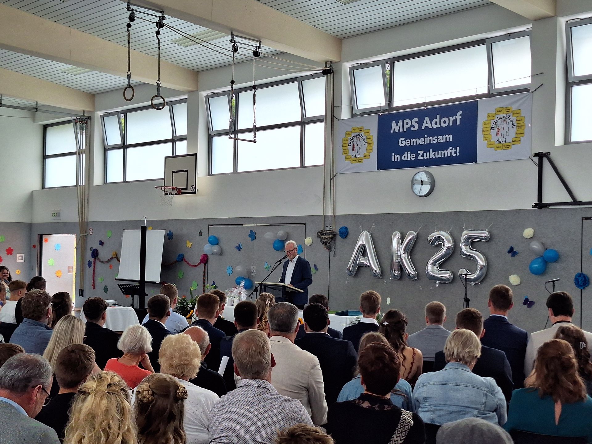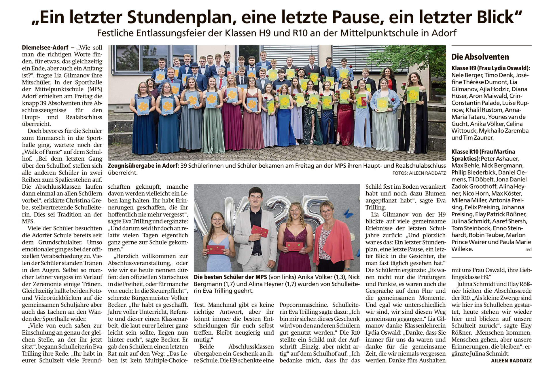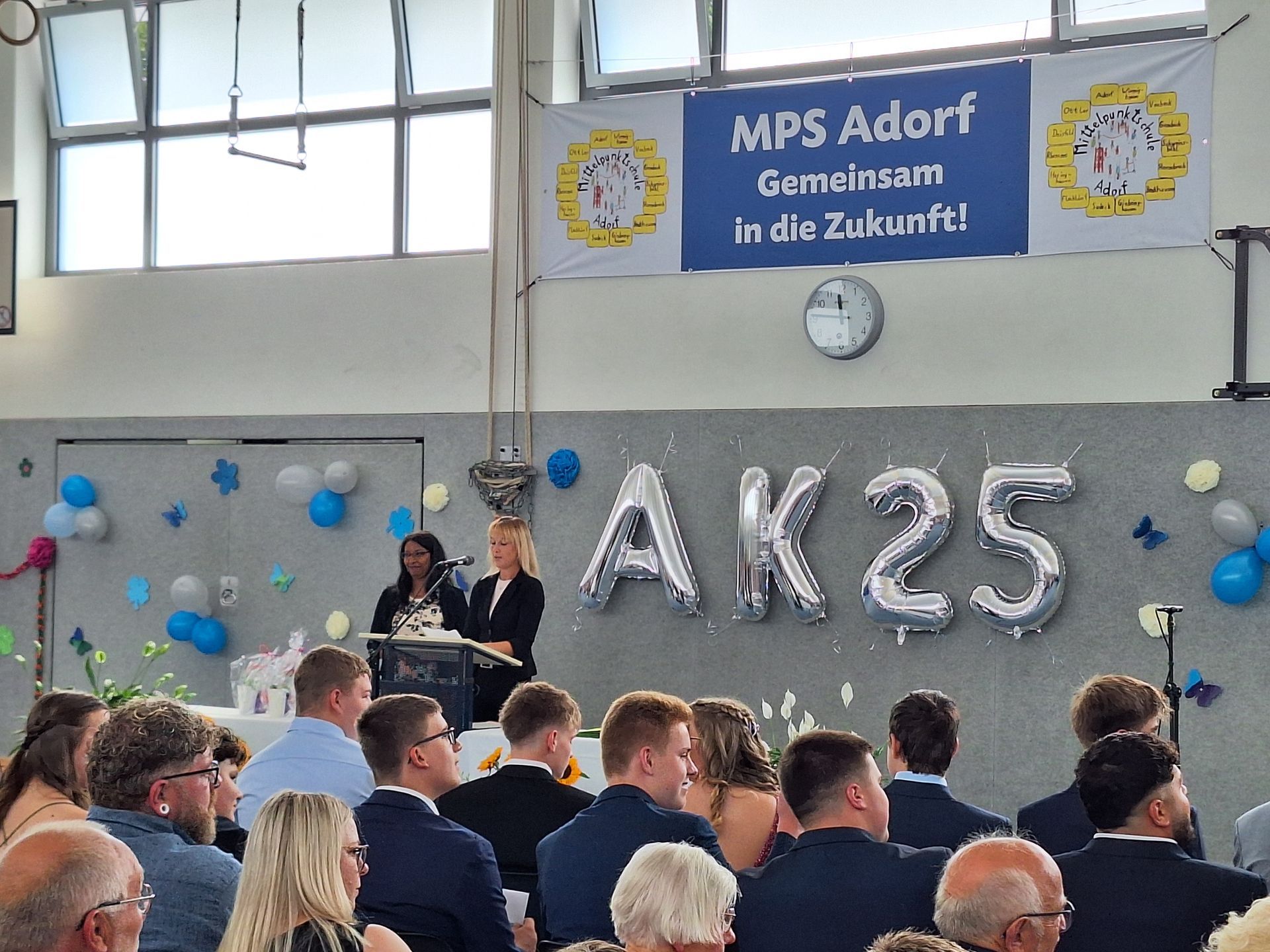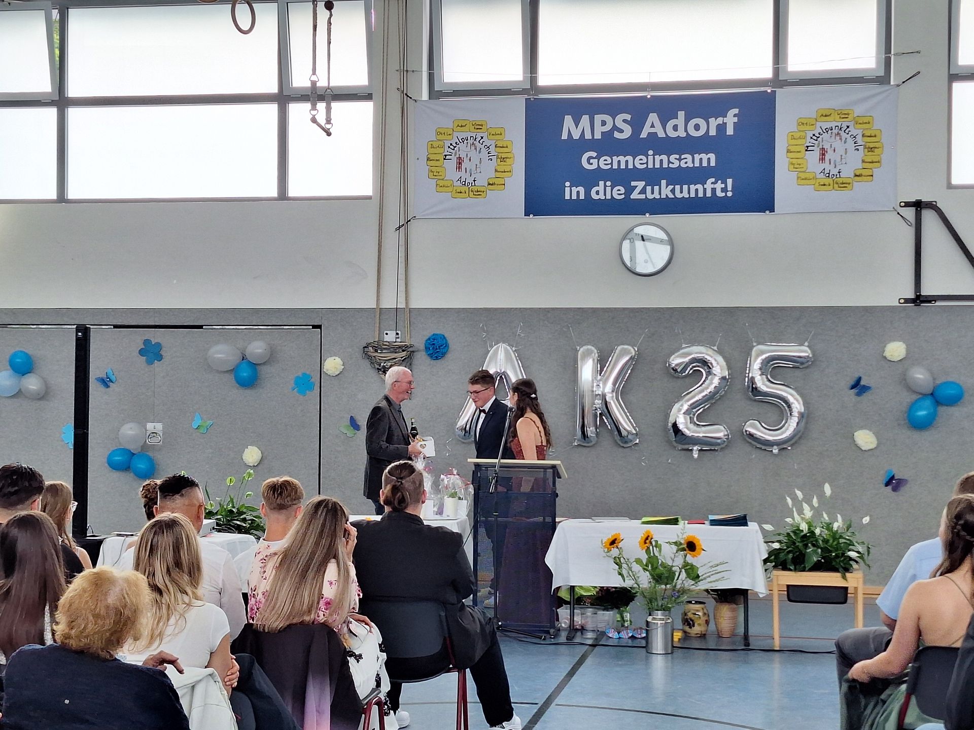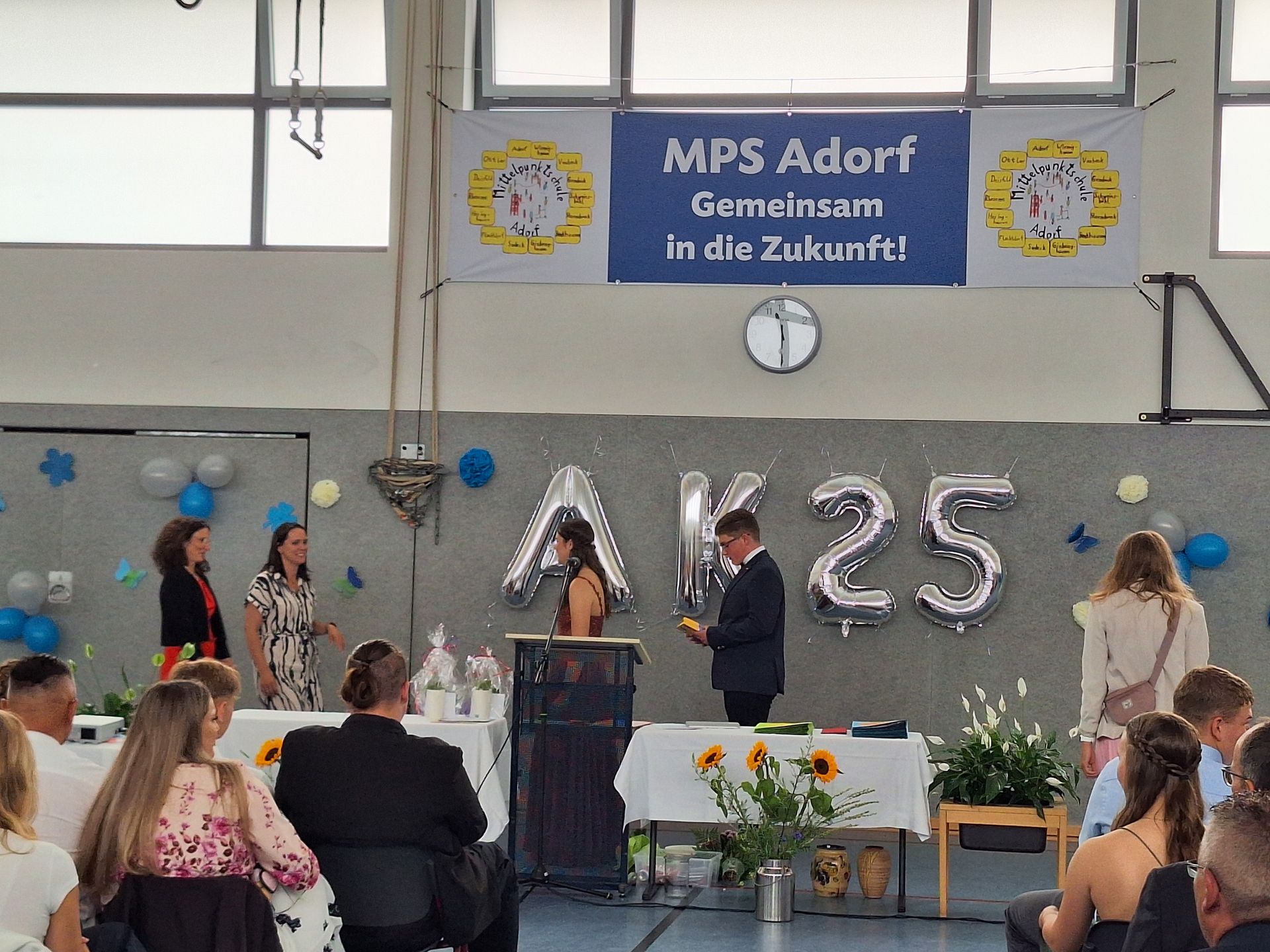 Mit kurzen Worten, aber mit Unterstützung einer Dia-Show ließen beide Abschlussklassen ihre Zeit an der MPS Adorf noch einmal Revue passieren. Die Bilder und Videos zeigten, dass es viele schöne und lustige Momente während der neun oder zehn Jahre in Adorf gab. Im Anschluss wurden die Lehrerinnen und Lehrer, die die Abschlussklassen über all die Jahre begleitet hatten, mit Geschenken bedacht.