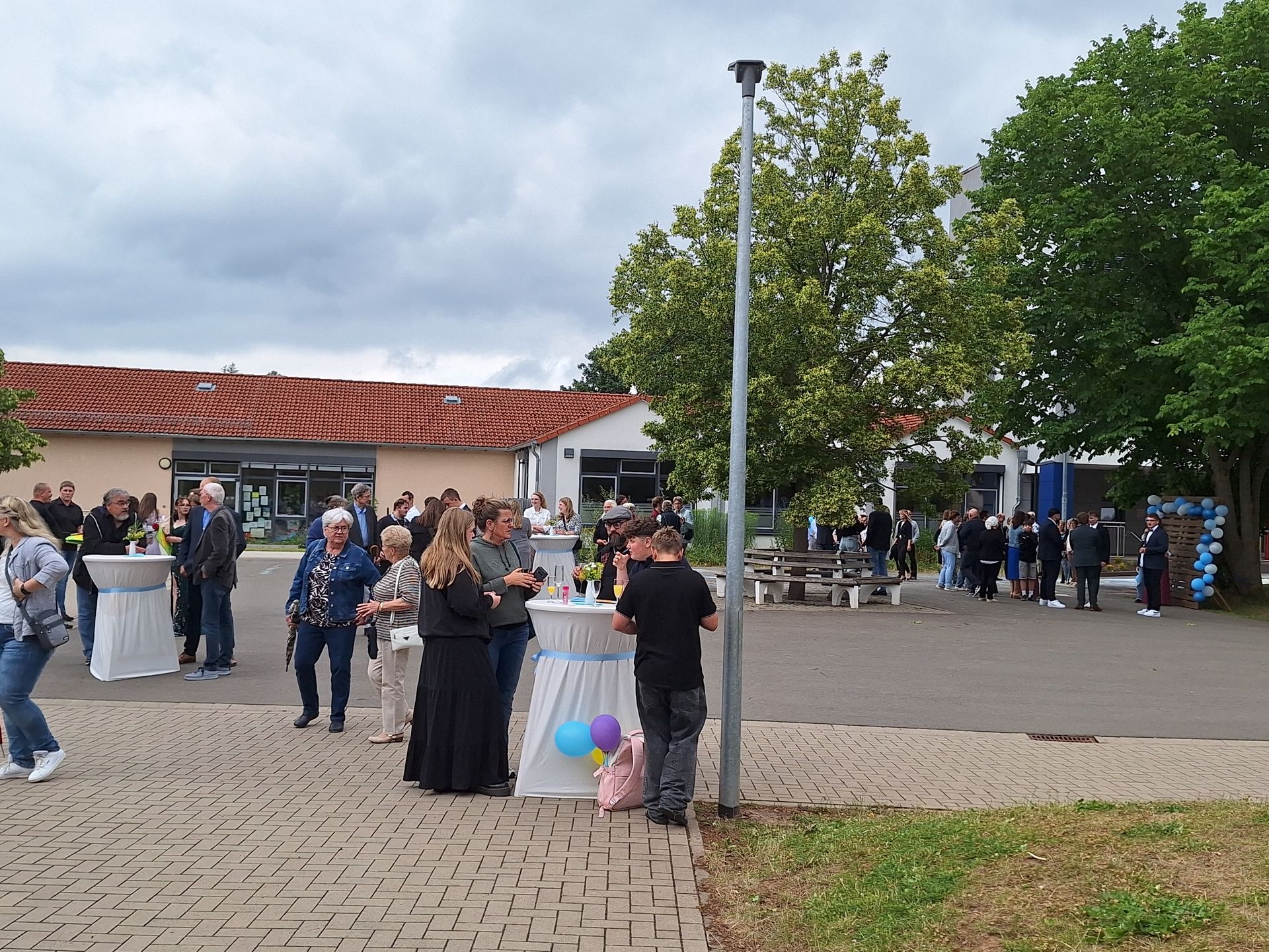 Im Anschluss an die Abschlussfeier versammelten sich alle bei wieder schönem Wetter zu einem Empfang auf dem kleinen Schulhof.