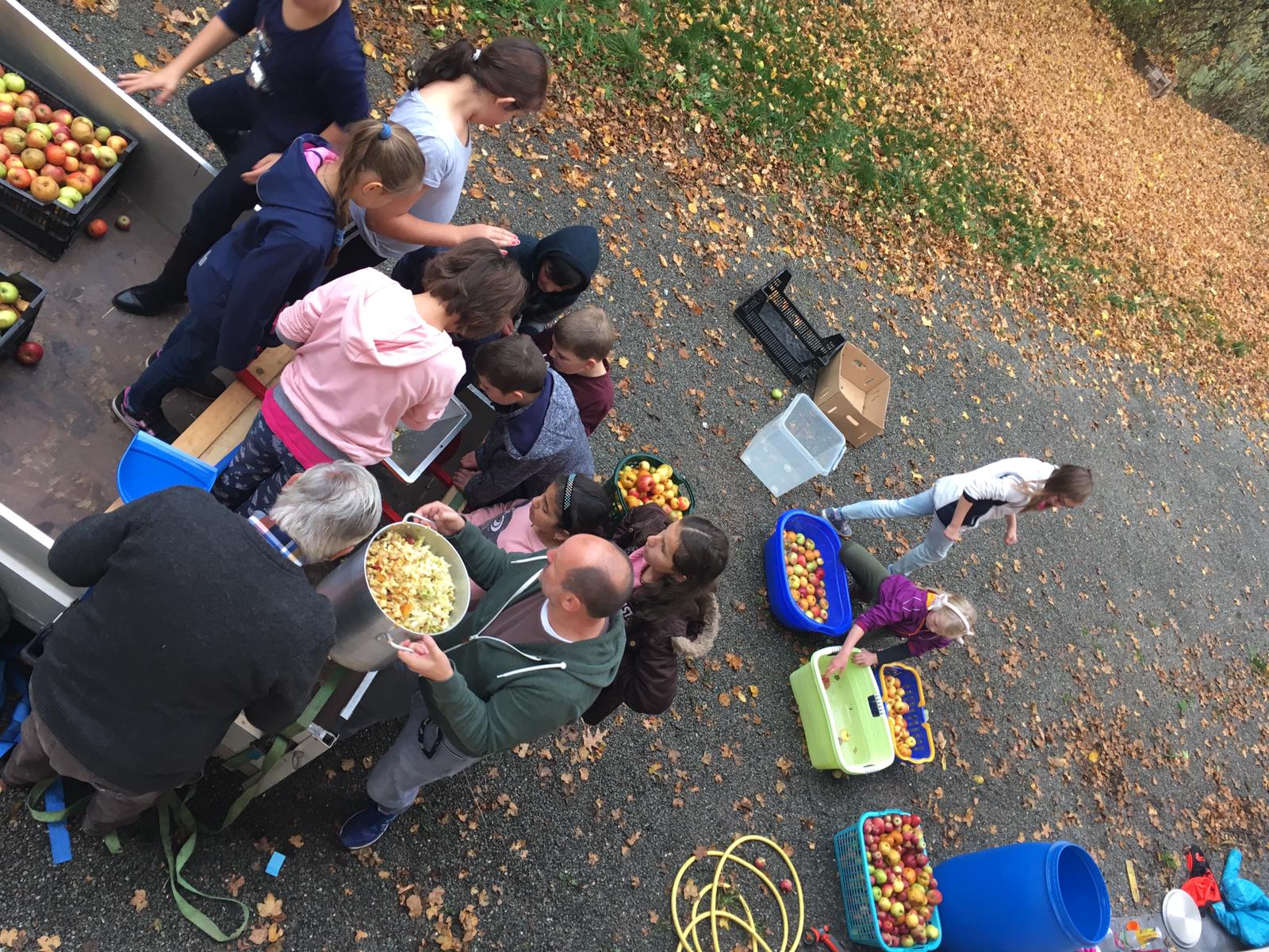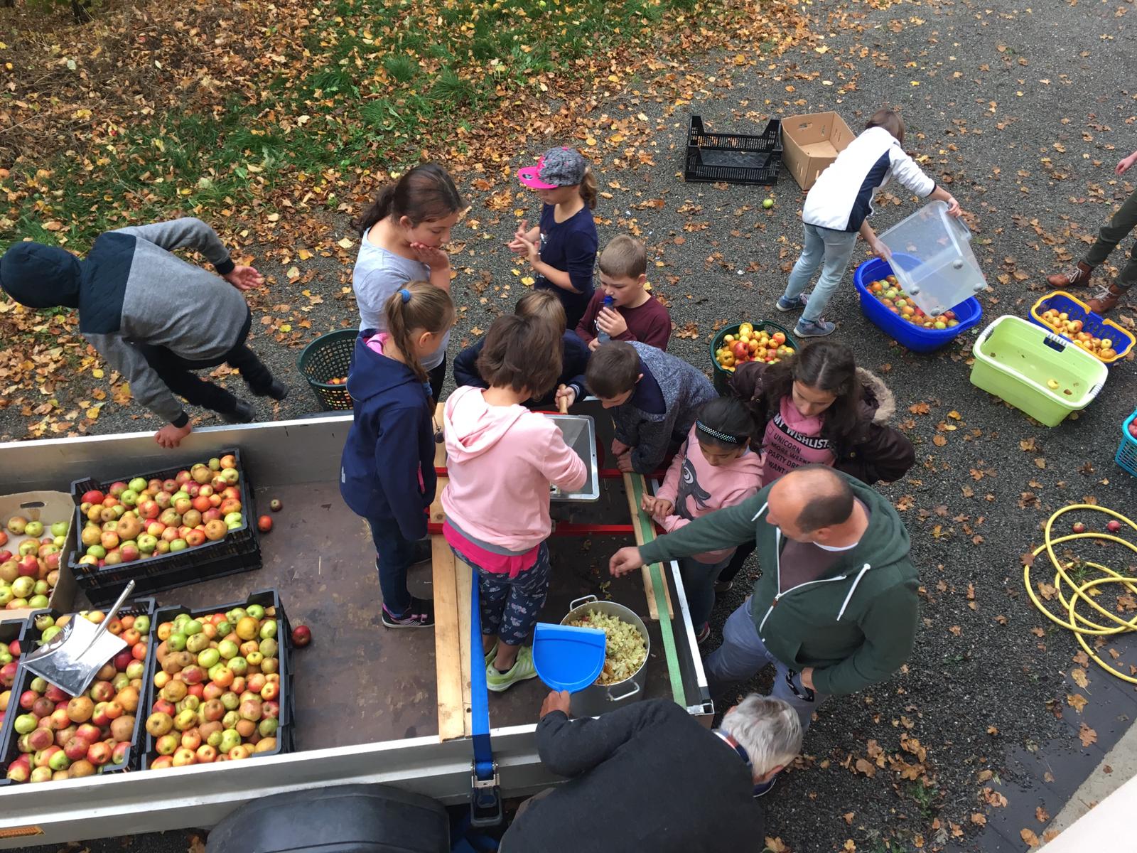 Die reiche Obsternte des Jahres wurde genutzt, um einen Apfeltag für die Grundschule durchzuführen. Nach dem 1. und 2.Klasse am Vortag die Äpfel auf der Streuobstwiese gesammelt hatten kam Herr Kümmel vom Naturpark Diemelsee mit seiner Obstpresse in die Schule, um die Äpfel zu Saft zu verarbeiten. Unter tatkräftiger Mithilfe der 3. und 4.Klassen wurden die Äpfel gewaschen und geschrotet und anschließend mit Muskelkraft zu Saft gepresst. Jedes Grundschulkind durfte sich eine Portion Saft abfüllen und probieren. Alle waren sich einig, dass der frische Saft richtig lecker war.