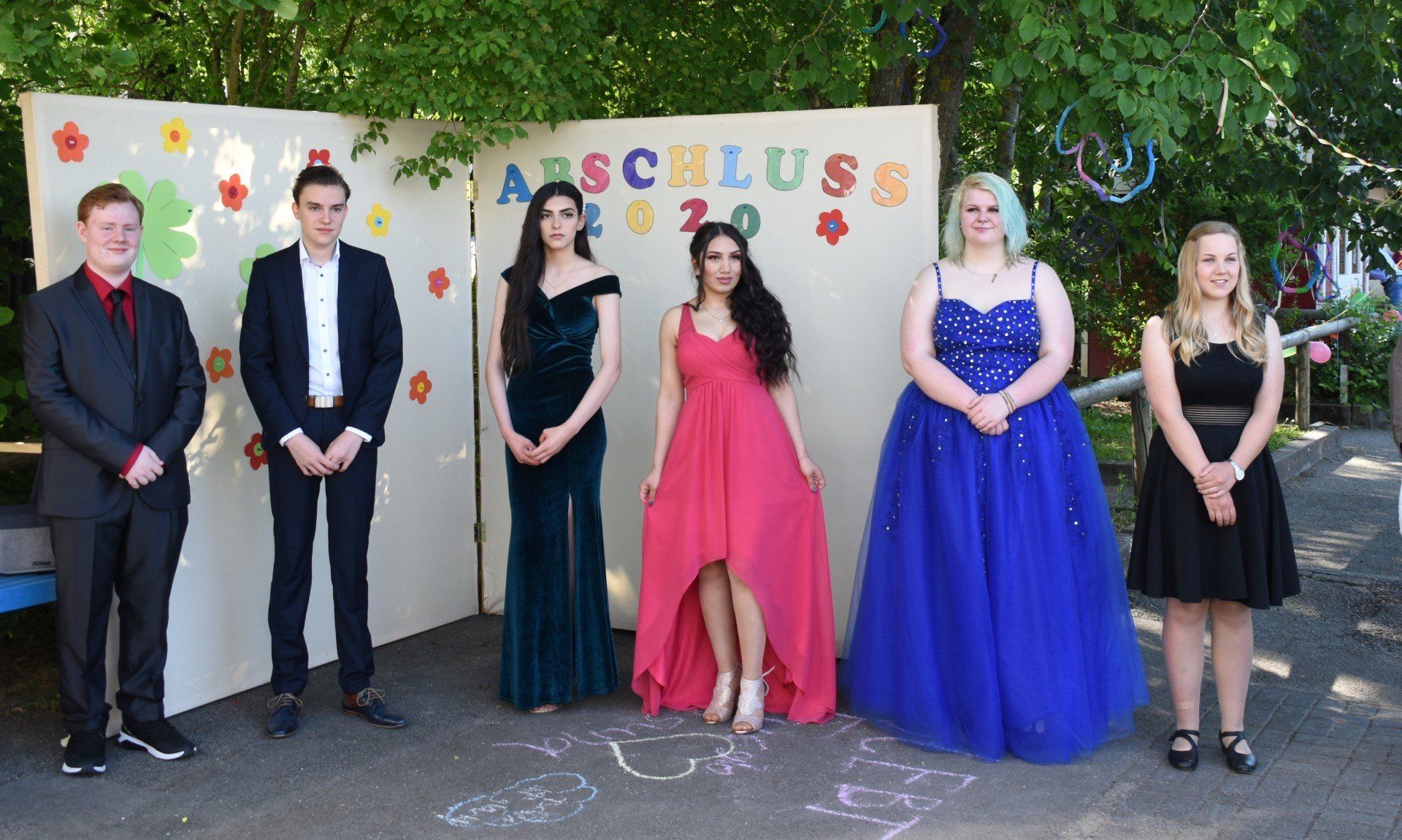 Eine schöne Alternative wurde entwickelt: In vier Gruppen kamen die EntlasschülerInnen mit ihren Familien und Freunden auf dem kleinen Schulhof zusammen. Die übrigen Klassen bereiteten ihnen beim Gang über den Schulhof einen feierlichen Empfang , sie bildeten ein Spalier, klatschen und jubelten und ließen Konfetti auf die Abgänger regnen. Am Vortag hatten sie den Schulhof schon mit bunten Kreidebildern und vielen Guten wünschen und Grüßen dekoriert.