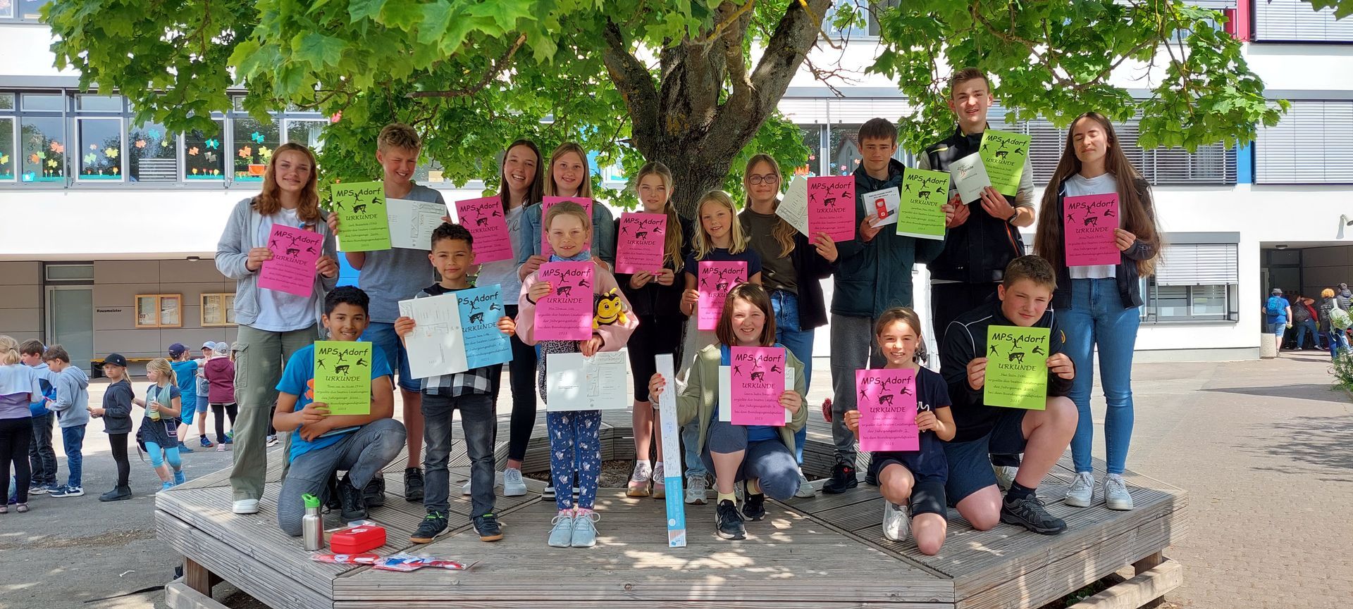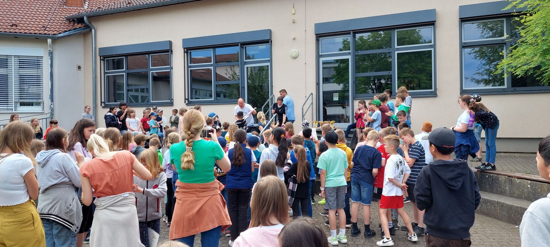 Da war die Freude aber groß - und die Überraschung auch. Herr Speer und Frau Zürker kamen überraschend in der Pause vorbei und gratulierten den Grundschulkindern zum 2. Platz im Grundschul-Cup. In verschiedenen Disziplinen hatten jeweils Mannschaften der Grundschule sich auf Kreisebene mit anderen Schulen gemessen und dabei von 17 Teilnehmern den 2. Platz in der Gesamtwertung belegt. Herzlichen Glückwunsch allen Teilnehmern!