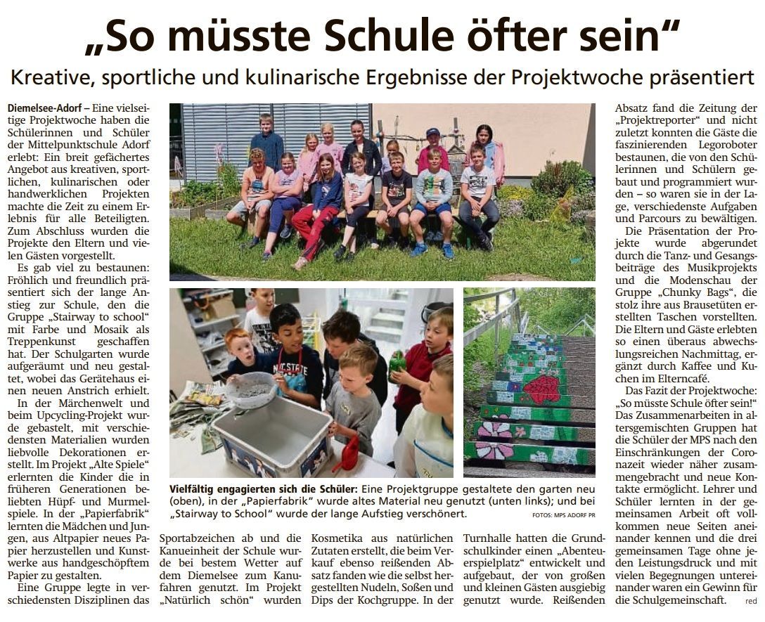 Eine tolle Zeit waren die drei Projekttage in der Woche nach Pfingsten. In bunt zusammengewürfelten Projektgruppen konnten die Kinder und Jugendlichen ihre persönlichen Vorlieben und Fähigkeiten einbringen. Die beeindruckenden und vielfältigen Erlebnisse wurden den Eltern und Gästen am letzten Projekttag präsentiert. Alle waren sich einig: So müsste Schule öfter sein!
